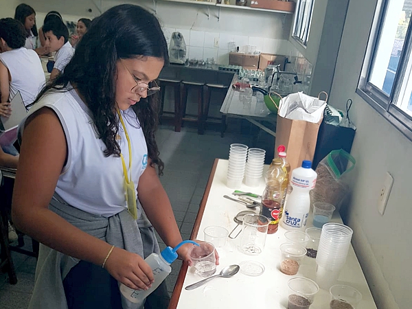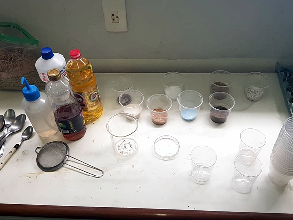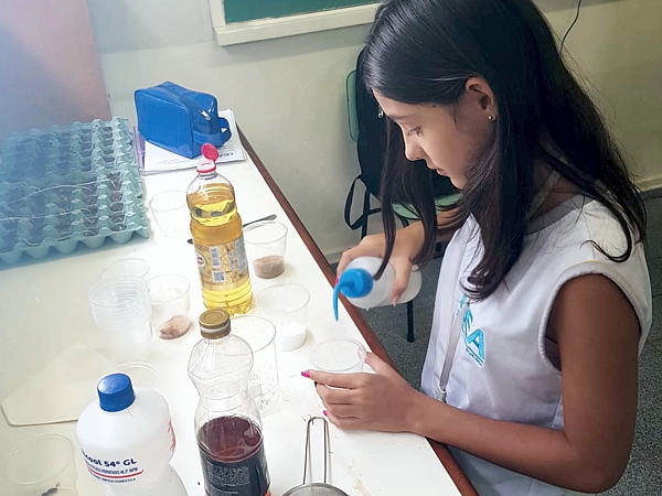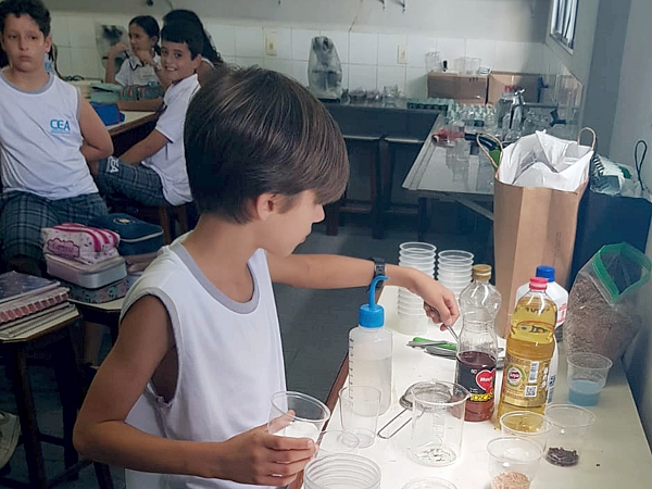 Entre os experimentos realizados, os estudantes se dedicaram a elaborar misturas líquidas homogêneas, misturas líquidas heterogêneas, misturas sólidas heterogêneas passíveis de separação por catação e dissolução, além de uma mistura contendo substâncias líquidas e sólidas classificada como homogênea, cuja separação foi realizada por decantação.
