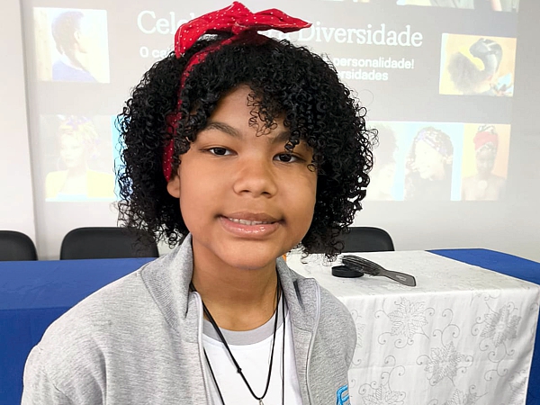 Sheila também fez uma demonstração prática, utilizando fotos e vídeos para mostrar técnicas de penteados e cuidados específicos para cabelos crespos e cacheados. Ela enfatizou a importância da autoaceitação, incentivando os estudantes dos 6º Anos a se sentirem bem com seus cabelos naturais, independentemente de padrões impostos pela sociedade.