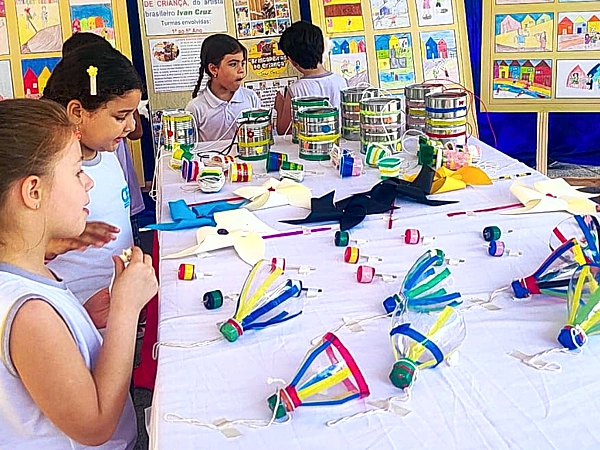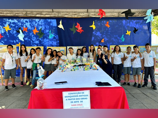 Além das criações visuais, o projeto incluiu atividades práticas nas aulas de Educação Física. A professora Daniane Santos incentivou os estudantes a experimentarem jogos e brincadeiras inspirados nas obras, como pula corda, bola de gude, cabo de guerra, entre outras. Cada turma também confeccionou brinquedos como pé de lata, cata-vento e telefone sem fio, que foram exibidos ao lado das releituras artísticas.