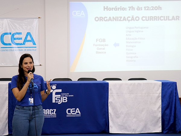 Além de esclarecer o conteúdo curricular, o evento contou com apresentações de alguns dos docentes que acompanharão os alunos durante o Ensino Médio. Cada professor falou sobre suas disciplinas, proporcionando aos pais e familiares uma visão geral do trabalho realizado na instituição. A equipe do CEA presente no encontro incluiu os professores Leonardo Queiroz Laporti, Nuciala Mognato Tureta, Anderson Casais, Leôncio Carlesso Guzzo, Lidimara Soares Monteiro e Fernanda Rodrigues Wolkartt.