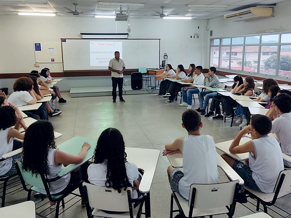 Os encontros, realizados nos dias 3, 4 e 12 de setembro, ocorreram na sala n.º 21 do Bloco “B”, Prédio Conselheiro Primo Bitti. Para proporcionar maior interação entre os participantes, os estudantes foram organizados em forma de círculo, o que facilitou o diálogo com Cazé, que fez uma série de questionamentos para estimular a reflexão dos jovens. Perguntas como “Quando eu for ‘gente grande’, serei?”, “Estudar é importante?” e “Qual a importância de manter uma rotina de estudos?” conduziram o bate-papo de maneira interativa.