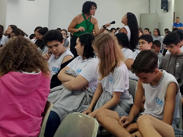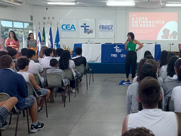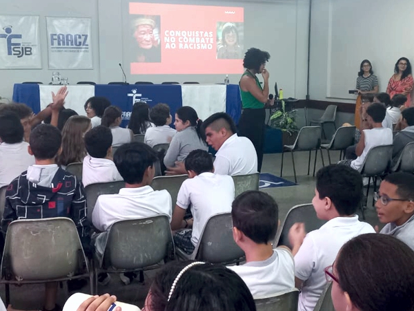 Na ocasião, “Consciência, Cor e Arte” foi apresentado aos estudantes dos 6º, 7º, 8º e 9º Anos do Ensino Fundamental pela professora Lidimara. O evento de apresentação aconteceu no auditório da escola e contou com a palestra “A luta antirracista no Brasil”, ministrada pela psicóloga e professora do curso de Psicologia da FAACZ, Stéfani Martins Pereira, e pelas estudantes do 7º período, Maria Eduarda Marins Pereira e do 9º período, Thalia Fantin de Oliveira.