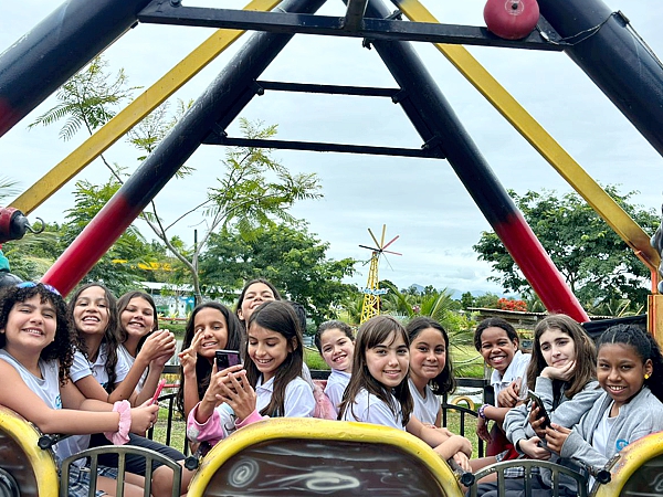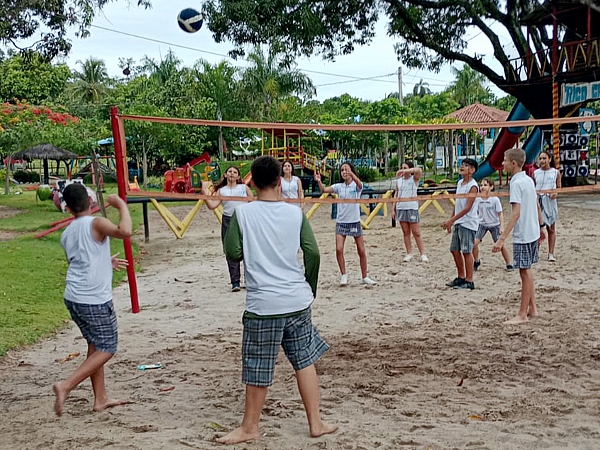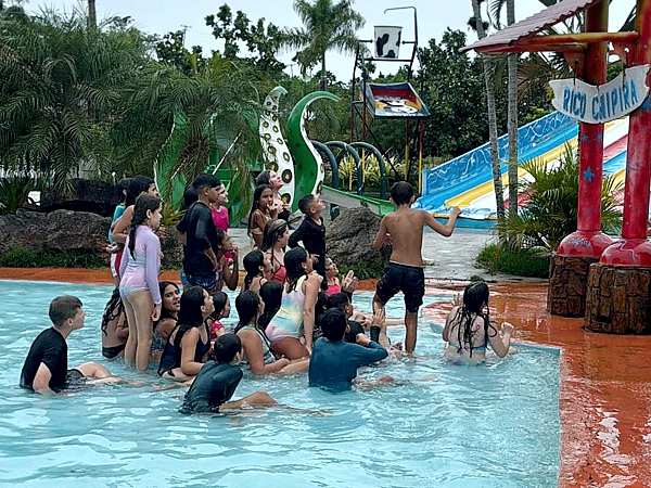 Além disso, os alunos aprenderam sobre a seringueira e o látex, bem como sobre o Pau-Brasil, ampliando seu conhecimento sobre a flora brasileira. A programação também incluiu diversas atividades recreativas, como pula-pula, parquinho, tirolesa de pequeno porte, slackline, campo de furingo, casinha na árvore, quadra de vôlei de areia, salão de jogos e a Vila do Calor, onde se divertiram com um refrescante banho de piscina.