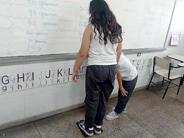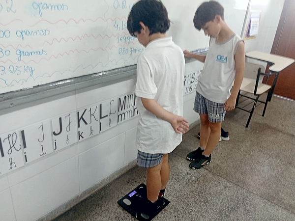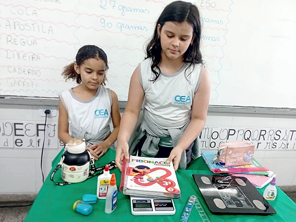 Com proposta simples, porém extremamente eficaz, a atividade convidou os estudantes a observar diferentes objetos do ambiente escolar, estimar quanto cada um pesava e registrar suas hipóteses. A etapa seguinte foi a confirmação prática: utilizando uma balança, as crianças puderam conferir o peso real dos itens e o compararam com suas estimativas iniciais.
