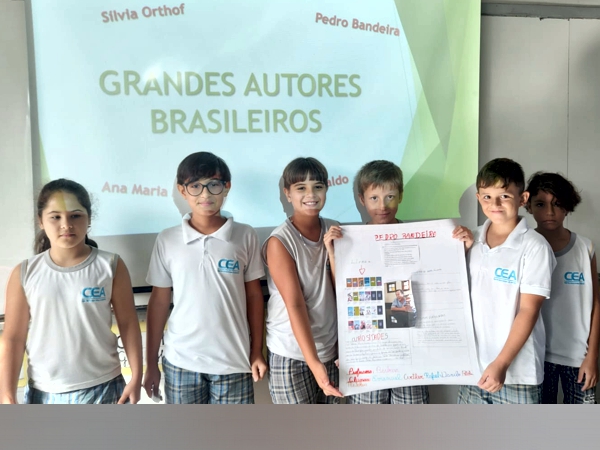 Os alunos dos 4º Anos, das turmas “A” e “B” do Ensino Fundamental, do período matutino, do Centro Educacional de Aracruz (CEA), participaram de uma apresentação prática de Língua Portuguesa dedicada a homenagear grandes nomes da literatura nacional. A atividade foi supervisionada pela professora regente Bárbara P. Alves Romaneli e teve como tema central “Grandes Autores da Literatura Brasileira”.
