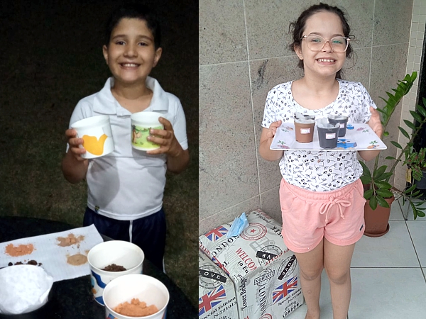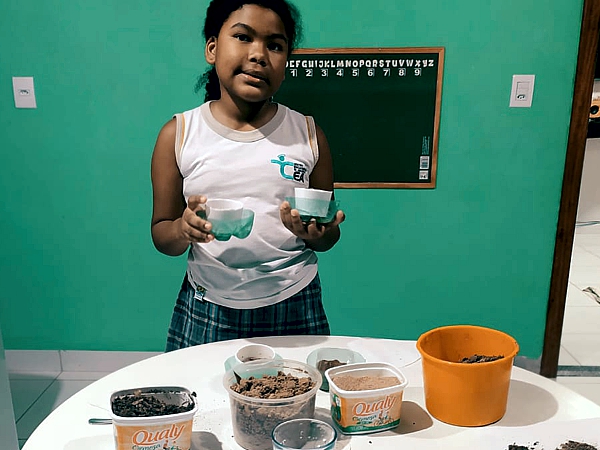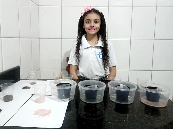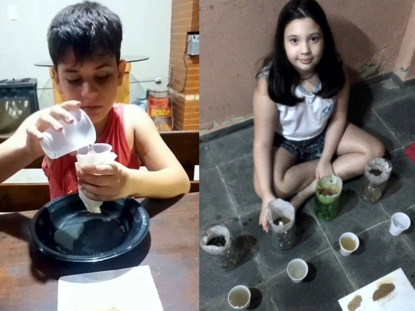 “Nossa, achei muito legal fazer a experiência. Eu ajudei minha mãe a separar os materiais e realizamos a atividade juntas. Usei argila, terra e filtros de papel. A parte mais divertida foi gravar e mandar para tia Jenniffer”. Larissa Garozi Tessarolo.