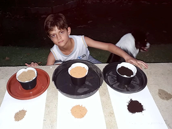 “Eu e minha mãe fomos à casa do meu avô pegar os tipos de solos. Nós ensaiamos para gravar o vídeo e preparamos os solos para experiência. Eu gostei muito de fazer a atividade com minha família”. Amanda Recla Sarcinelli.