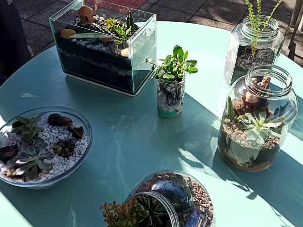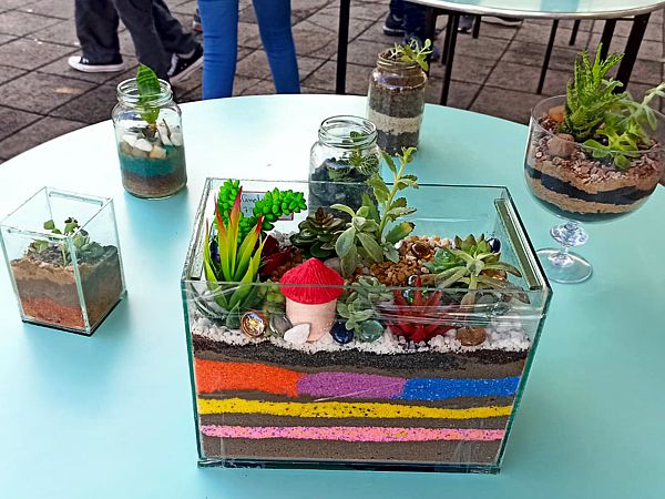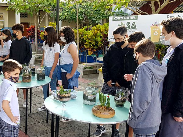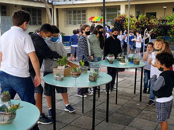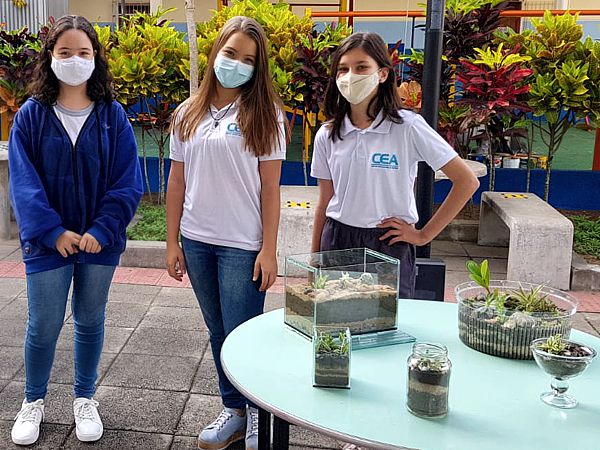 Os terrários produzidos pelos estudantes foram expostos a visitação das turmas do Ensino Fundamental e Médio, bem como de professores e funcionários da equipe administrativa e pedagógica do CEA, no pátio da escola.