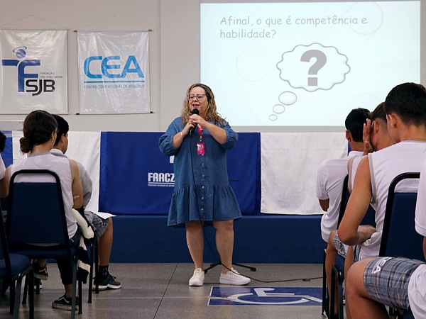 Ao longo de sua apresentação, Patricia, que tem ampla experiência em temas educacionais e na preparação para o Enem, lançou questionamentos provocativos aos estudantes do CEA, como: “Afinal, o que é competência e habilidade?”. Ela desafiou os alunos do Ensino Médio a realizarem uma autoavaliação, identificando suas forças, fraquezas, dificuldades e oportunidades por meio de uma análise SWOT, com o objetivo de promover o autoconhecimento e o desenvolvimento pessoal e acadêmico.