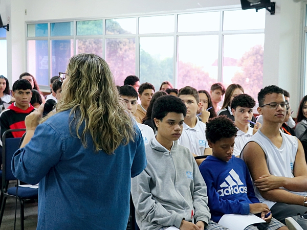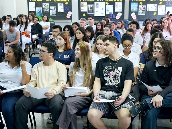 Outro ponto abordado foi a correção da redação, que é avaliada em cinco critérios e vale até 200 pontos: domínio da norma padrão da Língua Portuguesa, compreensão da proposta de redação, seleção e organização das informações, conhecimento necessário para a argumentação, e elaboração de uma proposta de solução para os problemas abordados. Patricia Oliveira alertou os estudantes do Ensino Médio do CEA sobre as situações que podem levar à anulação ou zeramento da redação, como fuga total ao tema, desobediência à estrutura dissertativo-argumentativa e assinatura fora do local designado.