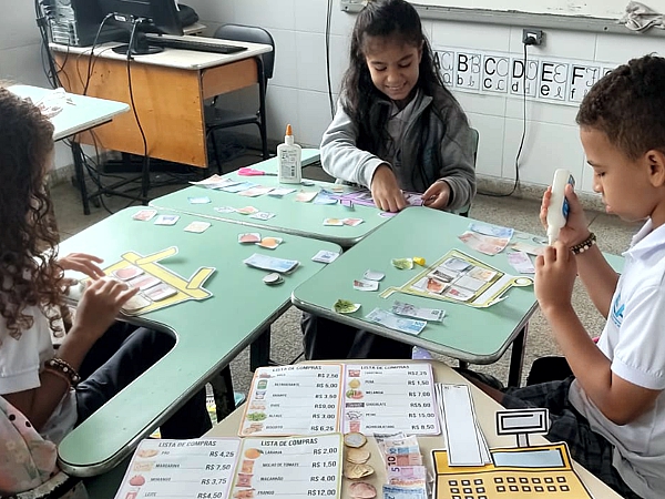 Durante a atividade, os estudantes do Ensino Fundamental do CEA aprenderam a calcular o troco, realizar operações de soma, identificar as cédulas e resolver situações-problema. Para isso, a turma participou de uma discussão com a professora Maria da Penha sobre o valor do dinheiro, o consumo consciente e o processo de compra e venda, antes de simular a dinâmica de um comércio.