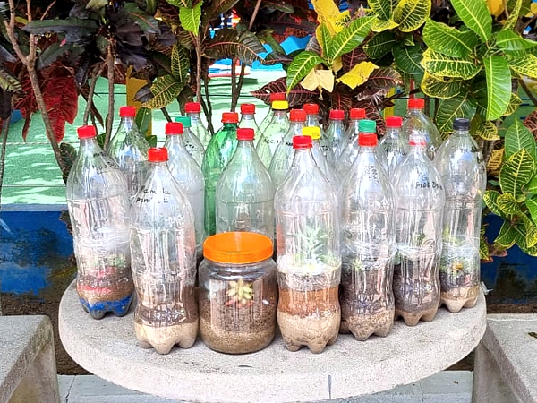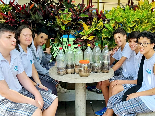Para realizarem a atividade, orientados pela professora Drielen, os estudantes trouxeram de casa garrafas pet, pedras, areia, terra, sementes ou plantinhas, fita adesiva e tesoura, o carvão era opcional. Ao longo dos próximos dias, os alunos do Ensino Fundamental do CEA devem analisar as mudanças que irão ocorrer dentro de cada terrário.